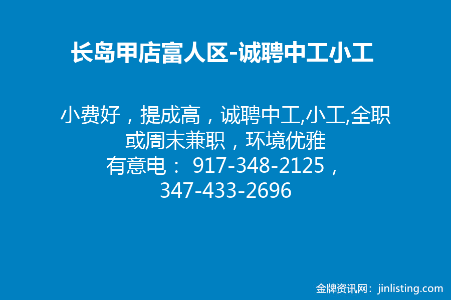 “长岛甲店富人区,小费好,提成高, 诚聘中工,小工, full time或周末Part time,环境优雅