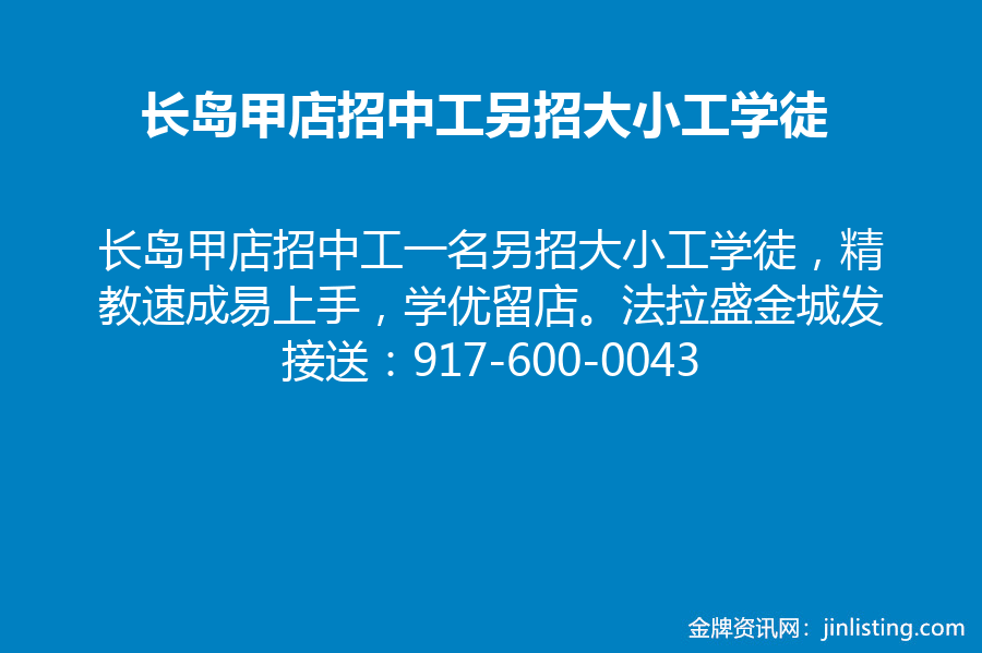 长岛甲店招中工一名另招大小工学徒,精教速成易上手,学优留店。法拉盛金城发接送:917-600-0043