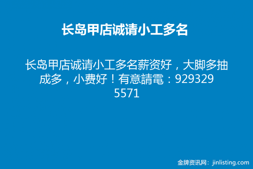 长岛甲店诚请小工多名薪资好,大脚多抽成多,小费好!有意請電:9293295571