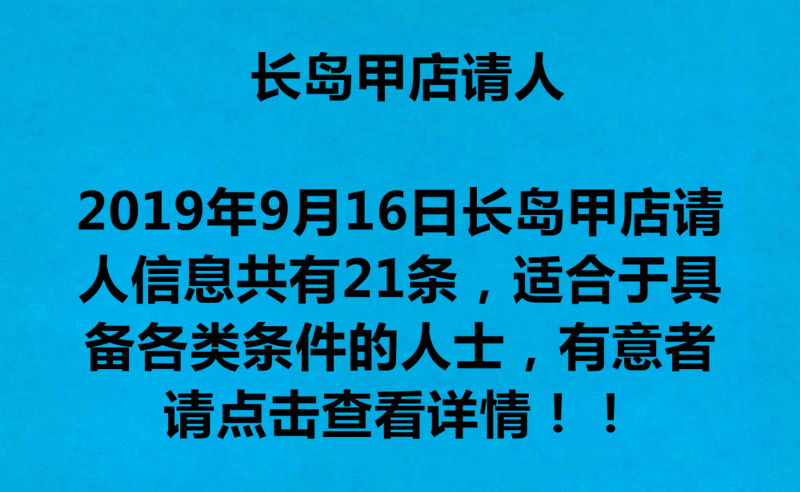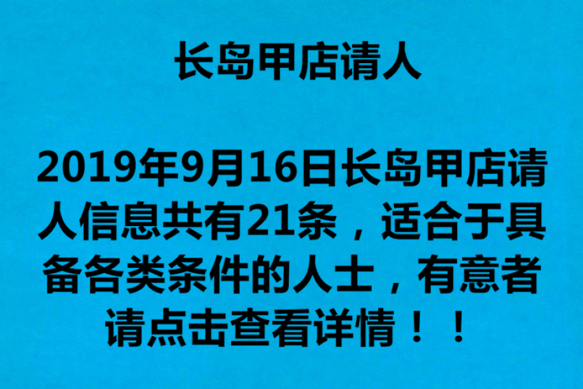 长岛甲店请人 “长岛甲店离法拉胜近,诚聘小工和中工。 周日节假日休息。 有意者请与7182161903 联系。”