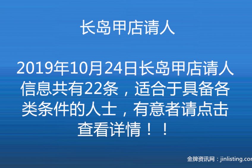 9.高檔豪華長島甲店 誠聘小工數名 全職半職均可 小費好 提成多 純白人區 老闆年輕事兒少 有意者請聯繫 646 371 7434