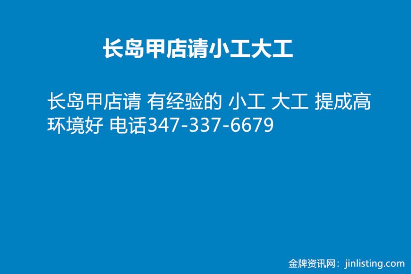 长岛甲店请 有经验的 小工 大工 提成高 环境好 电话347-337-6679