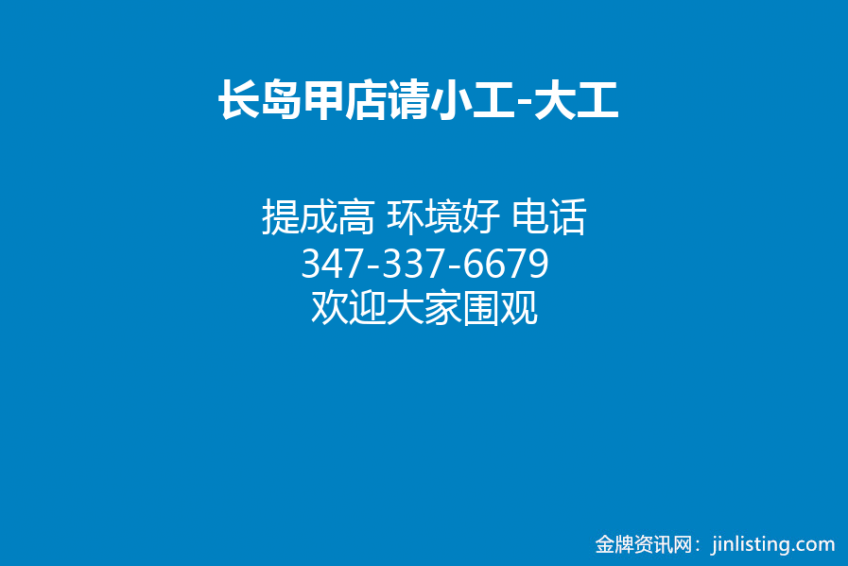 长岛甲店请小工 大工 提成高 环境好 电话347-337-6679 欢迎大家围观