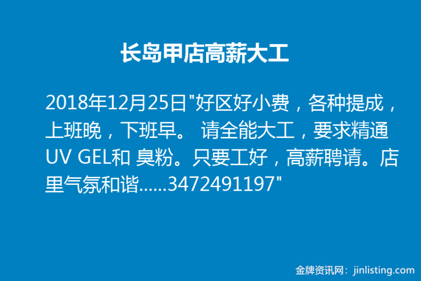 长岛甲店高薪大工 “好区好小费,各种提成,上班晚,下班早。 请全能大工,要求精通UV GEL和 臭粉。 只要工好,高薪聘请。店里气氛和谐,老板不事。 法拉盛495旁边接送。 有意请电:3472491197”