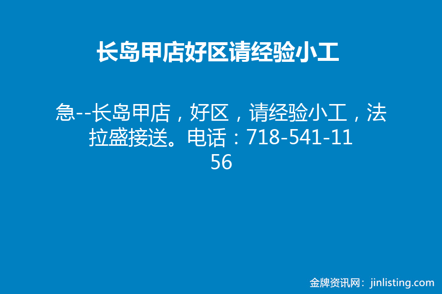 急–长岛甲店,好区,请经验小工,法拉盛接送。电话:718-541-1156