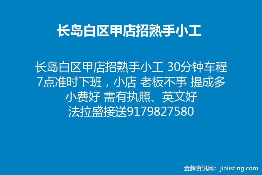 长岛白区甲店招熟手小工 30分钟车程 7点准时下班,小店 老板不事 提成多 小费好 需有执照、英文好 法拉盛接送9179827580