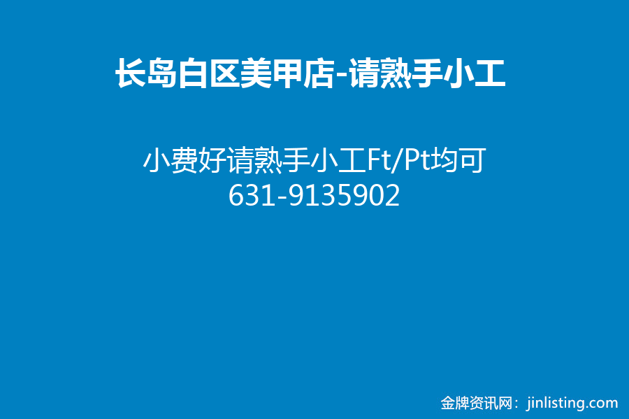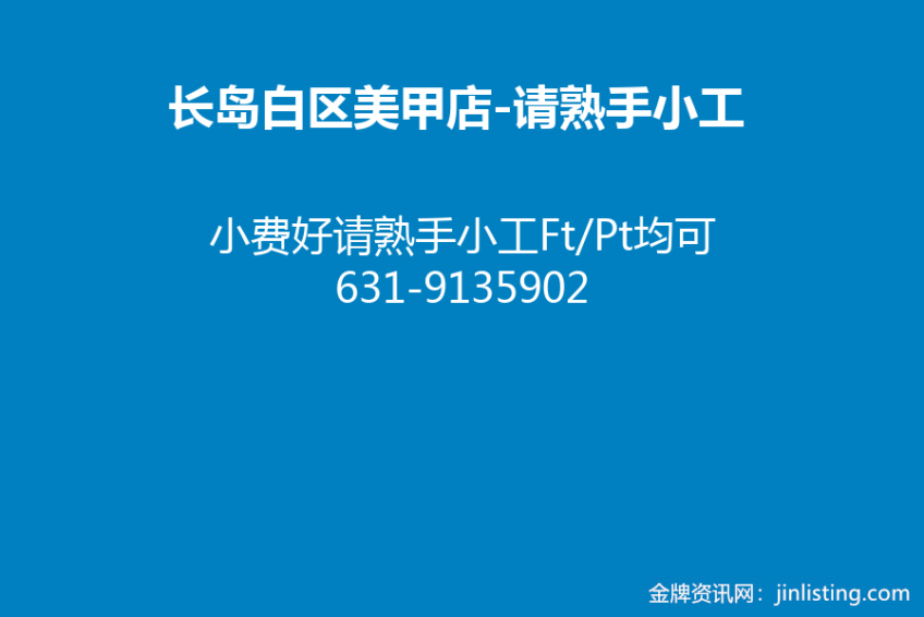 长岛白区美甲店 请熟手小工Ft/Pt均可 631-9135902