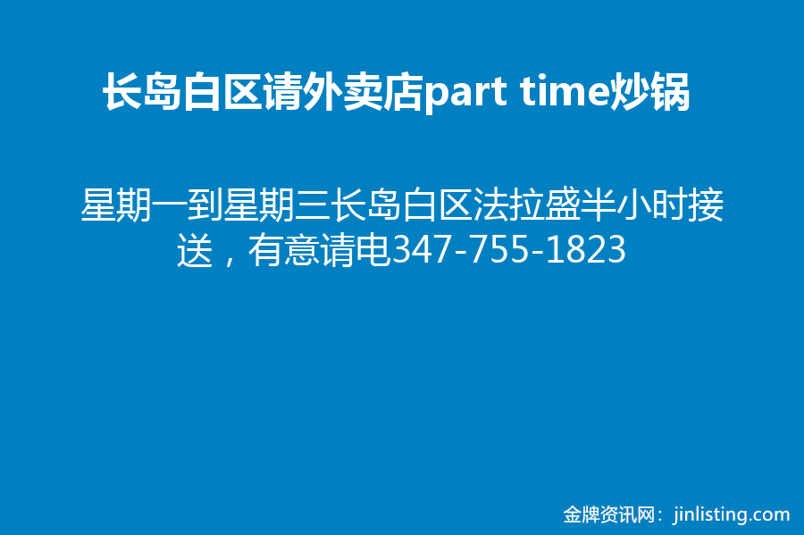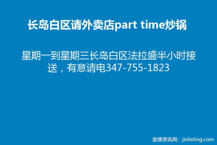 请外卖店part time炒锅星期一到星期三 长岛白区,法拉盛半小时接送,有意请电347-755-1823