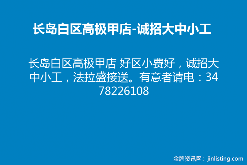 长岛白区高极甲店 好区小费好,诚招大中小工,法拉盛接送。有意者请电:3478226108