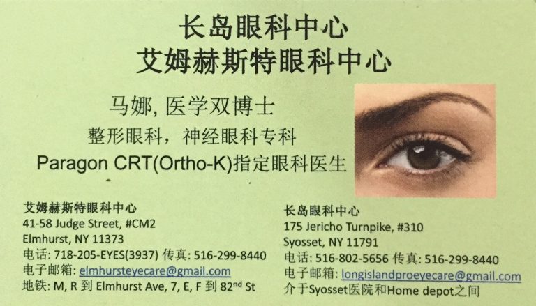 长岛眼科中心 艾姆赫斯特眼科中心 马娜, 医学双博士 整形眼科,神经眼科专科 Paragon CRT(Orth … 继续阅读长岛眼科中心516-802-5656