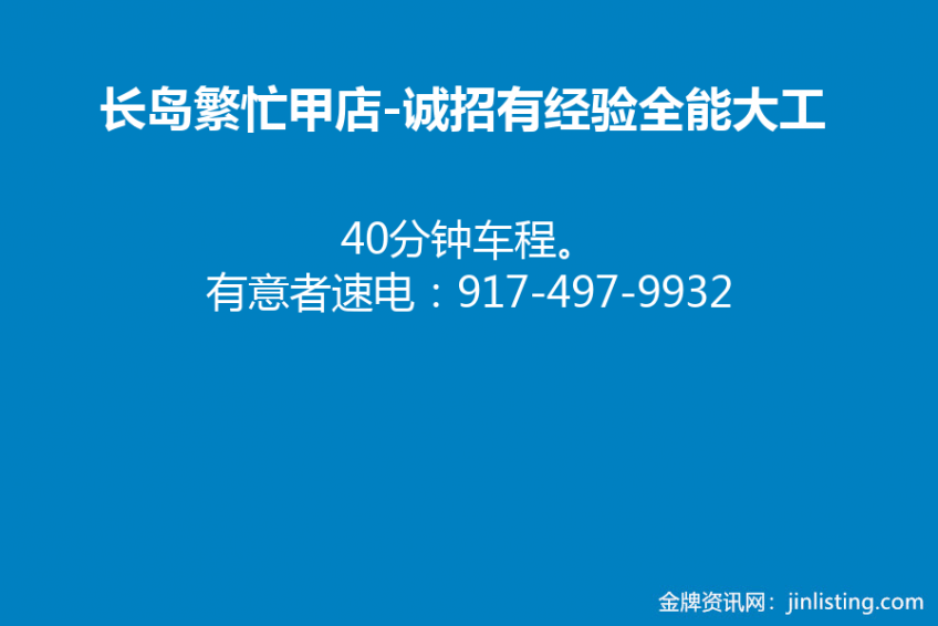 长岛繁忙甲店。诚招有经验全能大工。40分钟车程。有意者速电:917-497-9932