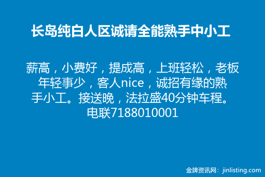 长岛纯白人区诚请全能熟手中小工,薪高,小费好,提成高,上班轻松,老板年轻事少,客人nice,诚招有缘的熟手小工。接送晚,法拉盛40分钟车程。电联7188010001