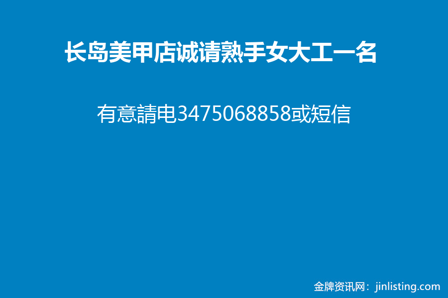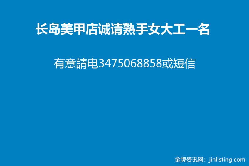 长岛美甲店诚请熟手女大工一名有意請电3475068858或短信