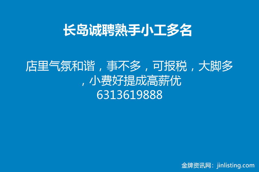 长岛诚聘熟手小工多名,店里气氛和谐,事不多,可报税,大脚多,小费好提成高薪优 6313619888