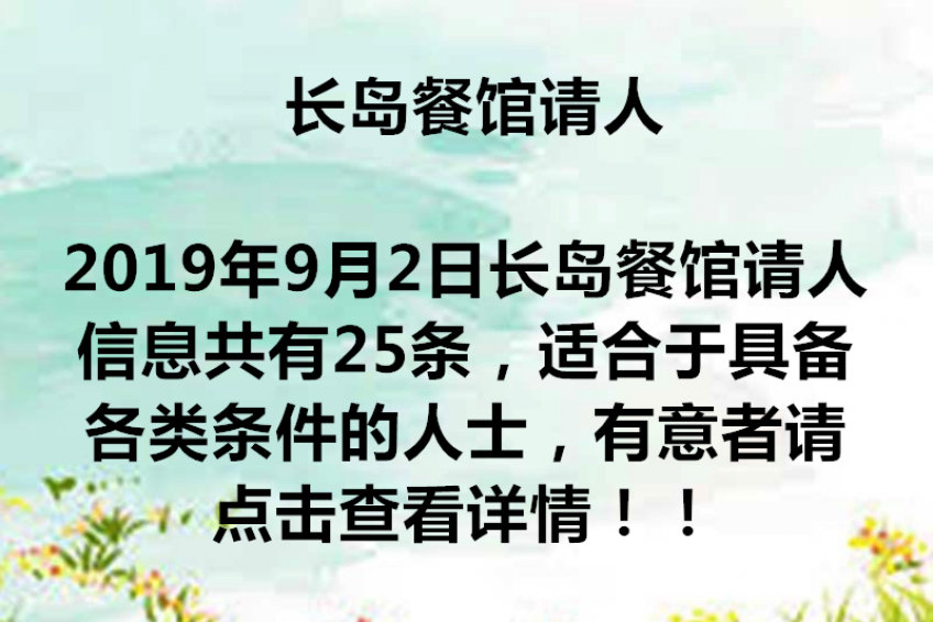 长岛亚洲餐馆 请Busboy Rnner 和英文好有经验的女收银员 法拉盛接送15分钟 有意电 3472078796 9175730043 谢谢