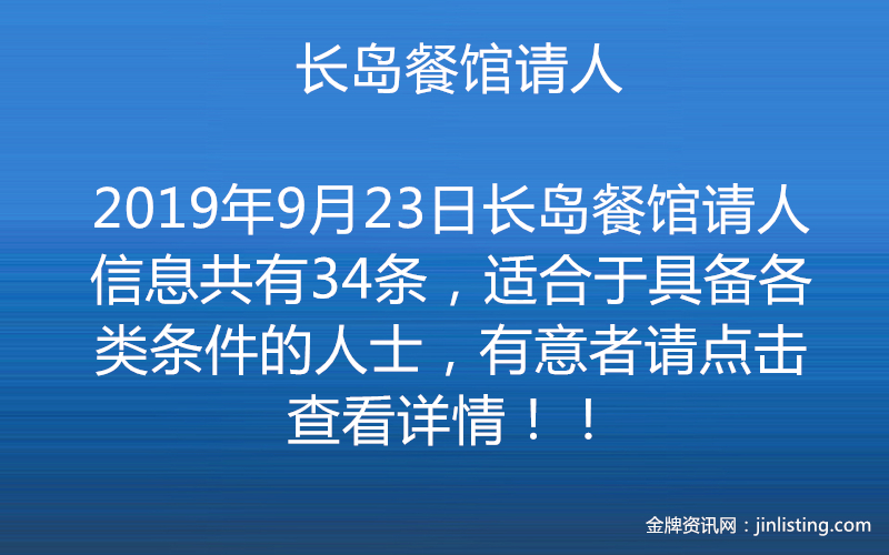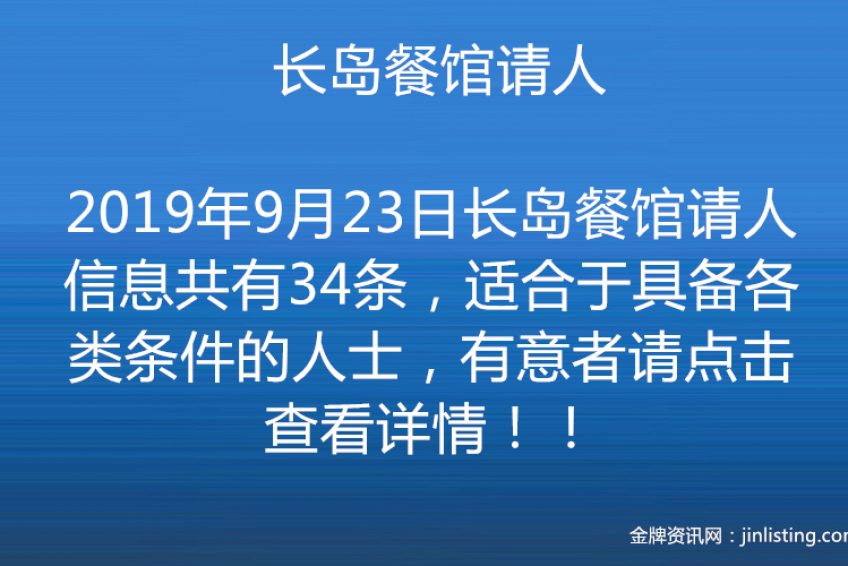 长岛市中餐馆请熟手企台,需英文流利,有合法身份,及传菜各一名,薪高粮准,交通方便,七号地铁步行即到,有意者请电3476068152