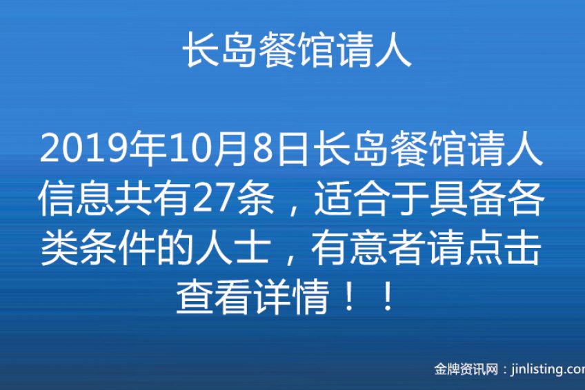 “长岛44出口,半个小时发拉盛接送,工作时间短, 有午休,无铁板,诚请有经验星期五,六企枱一名, 意者请电917-379-7398”