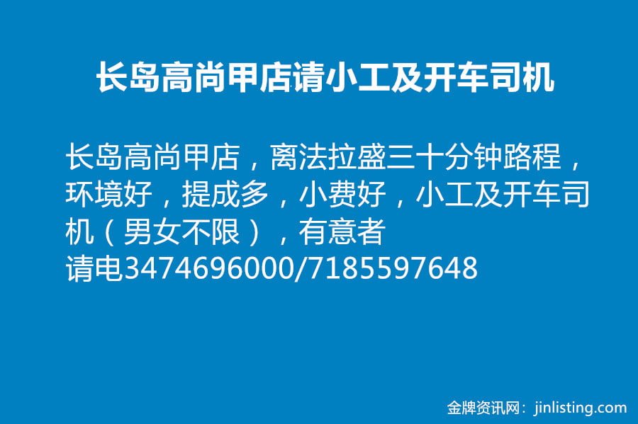 长岛高尚甲店,离法拉盛三十分钟路程,环境好,提成多,小费好,小工及开车司机(男女不限),有意者请电3474696000/7185597648