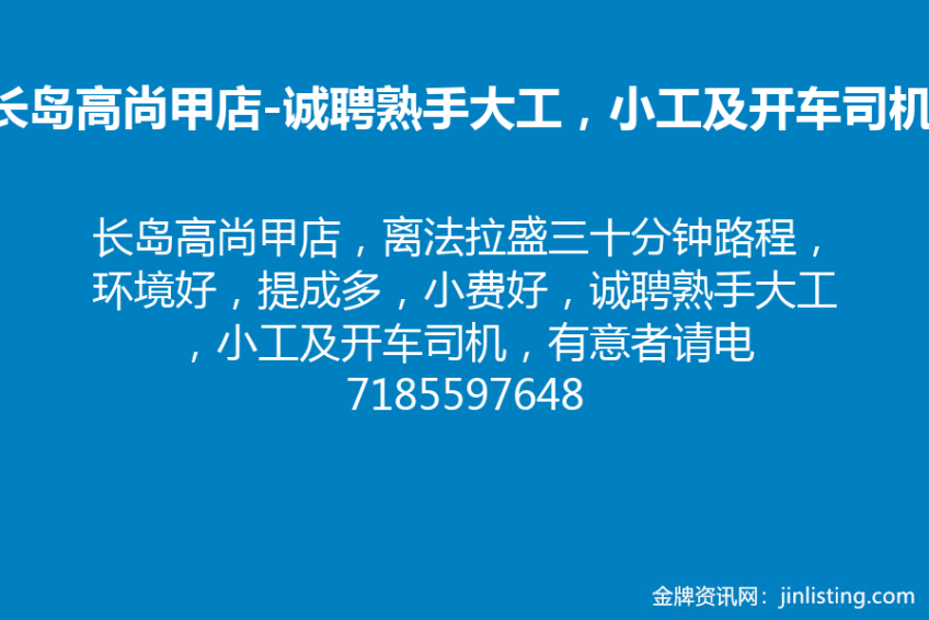 长岛高尚甲店,离法拉盛三十分钟路程,环境好,提成多,小费好,诚聘熟手大工,小工及开车司机,有意者请电7185597648