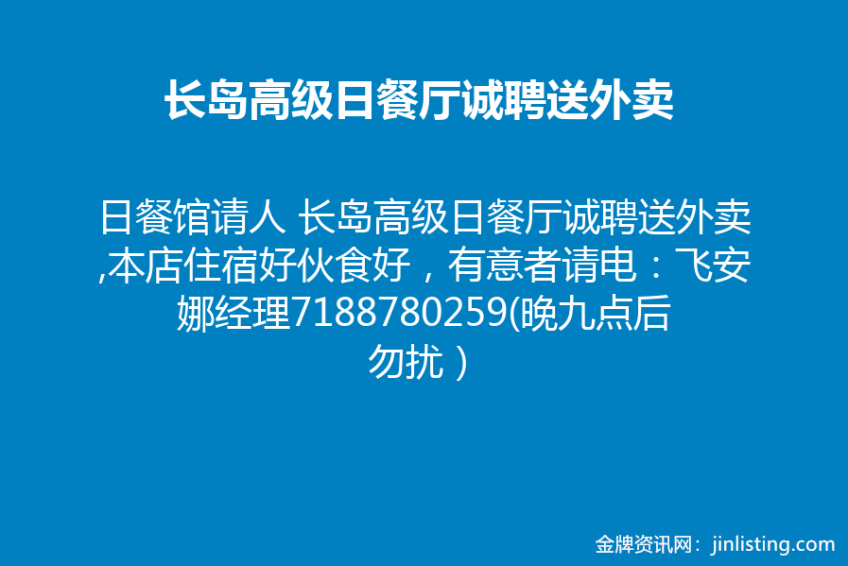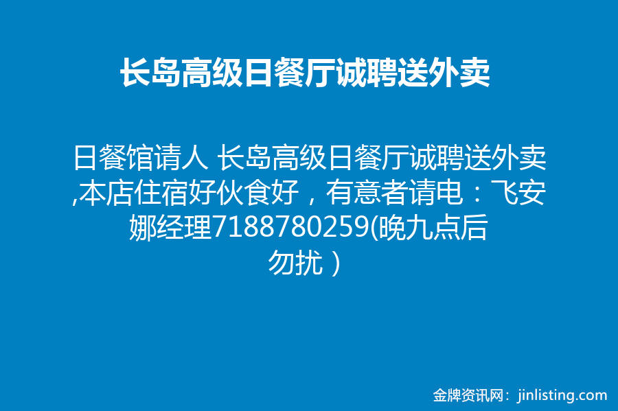 长岛高级日餐厅诚聘送外卖,本店住宿好伙食好,有意者请电:飞安娜经理7188780259(晚9点后勿扰)