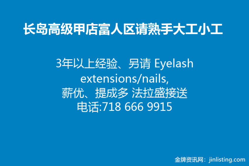 “长岛高级甲店富人区、请熟手大工、小工3年以上经验、另请 Eyelash extensions/nails, 薪优、提成多 法拉盛接送。