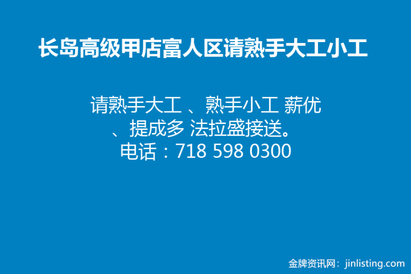 “长岛高级甲店富人区,请熟手大工 、熟手小工 薪优 、提成多 法拉盛接送。