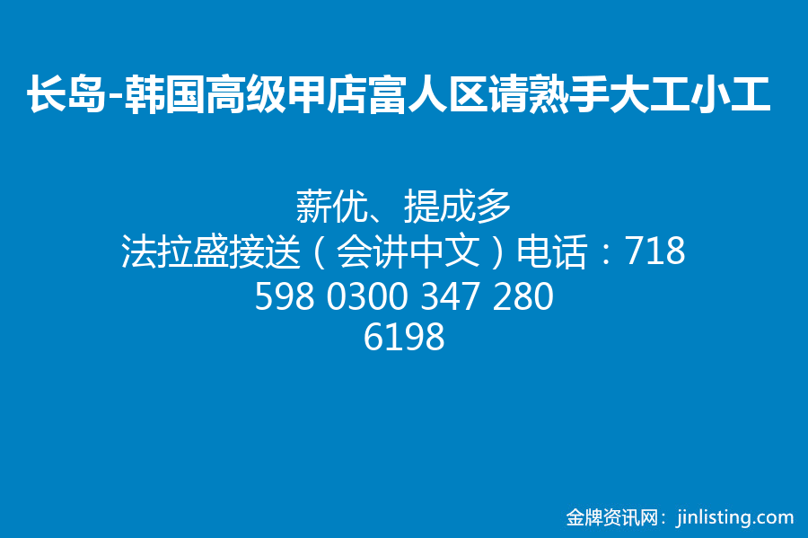 “长岛 韩国高级甲店富人区请熟手大工 熟手小工 薪优、提成多 法拉盛接送。(会讲中文)