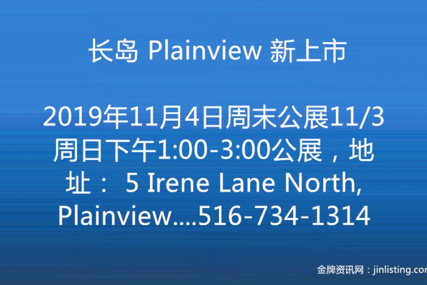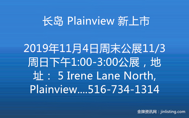 长岛 Plainview 新上市,周末公展 11/3周日下午1:00-3:00公展,地址: 5 Irene Lane North, Plainview, NY 11803. 9分学区,超大分层式,实用面积约2800Sqft,母女屋格局。独立一家庭,可当两家庭用。共6个卧室,3个全浴,3个半浴,1个办公室,2个全新厨房,Updated厕所,南北朝向,适和谐大家庭,也可自住 收租。仅售79万9。电经纪(516) 734-1314 随时约看。
