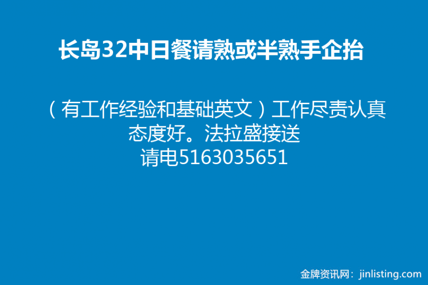 中餐館急請 长岛32中日餐请熟或半熟手企抬(有工作经验和基础英文)工作尽责认真态度好。法拉盛接送 请电5163035651