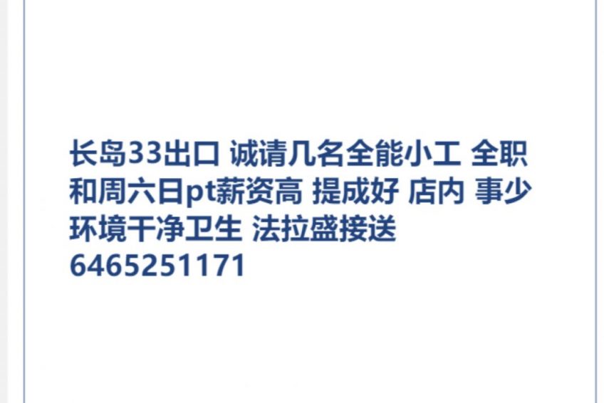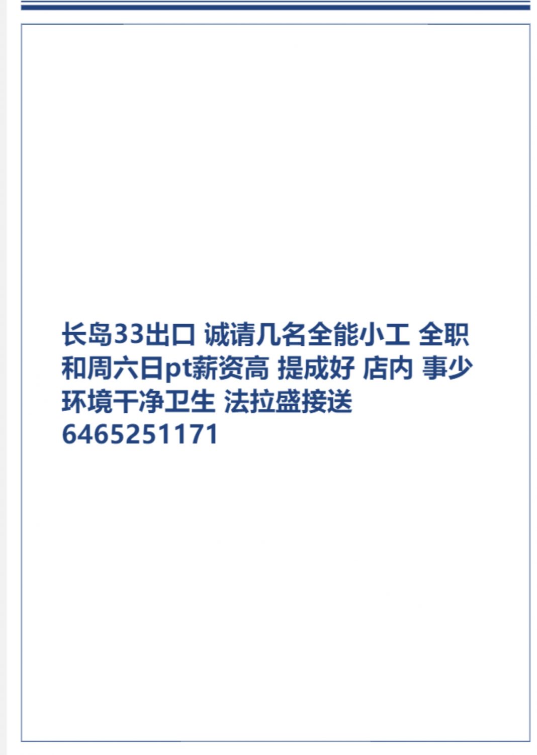 长岛33出口甲店诚请熟手小工数名,全职兼职皆可,会sns更佳,老板年轻事儿少,店里气氛和谐,有意者电话646-525-1171