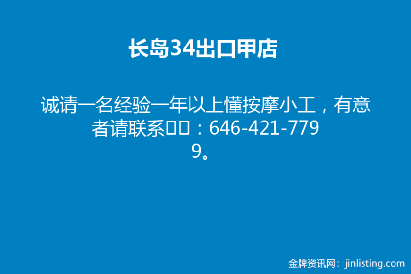 长岛34出口甲店,诚请一名经验一年以上懂按摩小工,有意者请联系☎:646-421-7799。