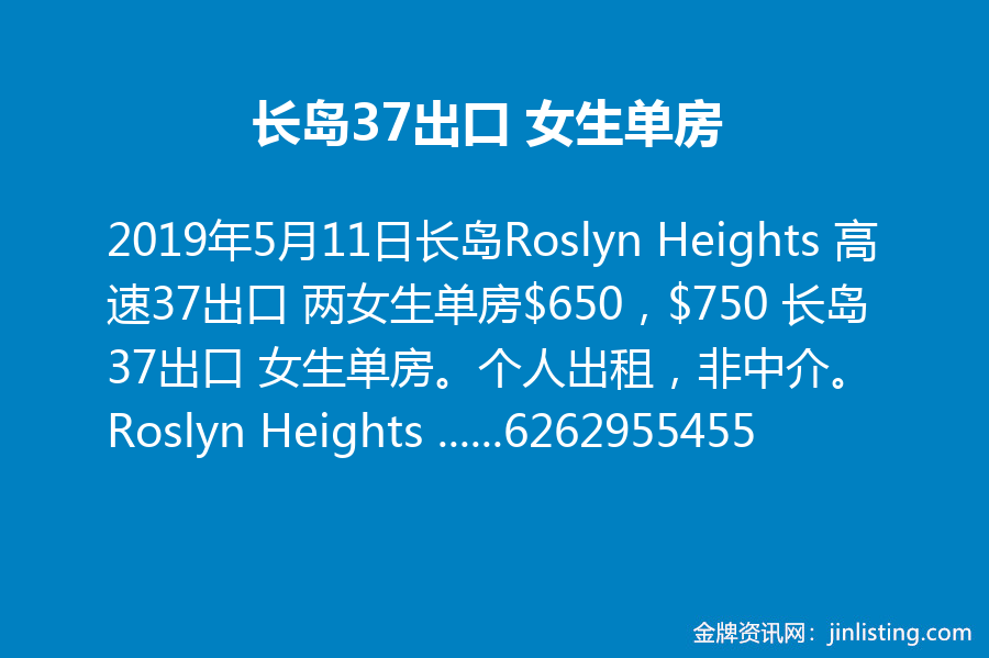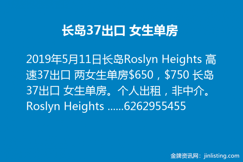长岛Roslyn Heights 高速37出口 两女生单房$650,$750 长岛37出口 女生单房。个人出租,非中介。 Roslyn Heights 超级安静安全干净的白人社区。 地理位置优越,下了高速路口2分钟。 距离法拉盛开车18分钟。 距离 Queens Community College 12分,hofstra 10分钟,NASSAU community COLLEGE 12分钟。 距离Garden City 开车10分钟,距离曼哈赛的Americana奢侈品购物中心5分钟, 距离38出口的大型shopping mall 也是10分钟, 距离中国新飞龙超市, BJ, 沃尔玛,Cosco 都是开车10分钟路程。超级方便、 联系电话6262955455