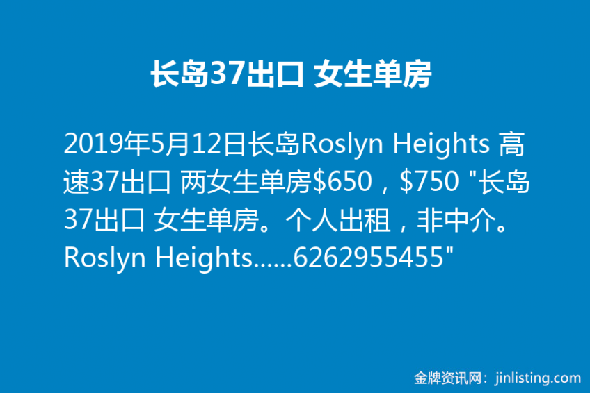 长岛Roslyn Heights 高速37出口 两女生单房$650,$750 “长岛37出口 女生单房。个人出租,非中介。 Roslyn Heights 超级安静安全干净的白人社区。 地理位置优越,下了高速路口2分钟。 距离法拉盛开车18分钟。 距离 Queens Community College 12分,hofstra 10分钟,NASSAU community COLLEGE 12分钟。 距离Garden City 开车10分钟,距离曼哈赛的Americana奢侈品购物中心5分钟, 距离38出口的大型shopping mall 也是10分钟, 距离中国新飞龙超市, BJ, 沃尔玛,Cosco 都是开车10分钟路程。超级方便、 联系电话6262955455”