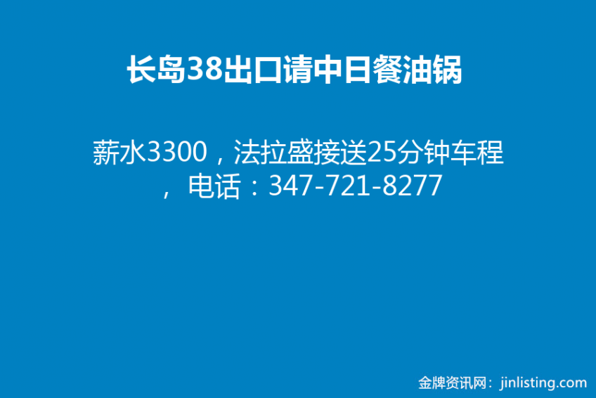 长岛38出口请中日餐油锅,薪水3300,法拉盛接送25分钟车程,电话:347-721-8277