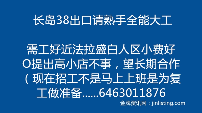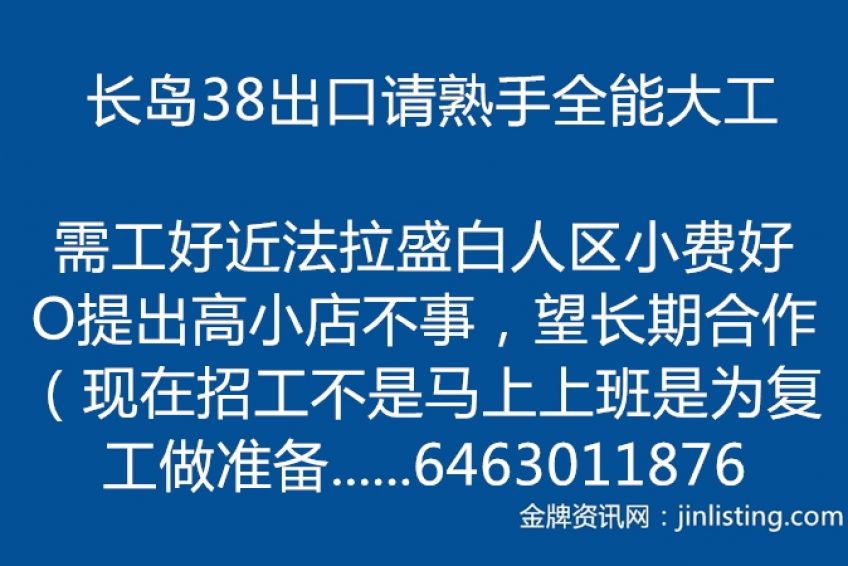 长岛38出口请熟手全能大工需工好 近法拉盛白人区小费好O提出高小店不事,望长期合作(现在招工不是马上上班是为复工做准备,希望理解!)请电6463011876