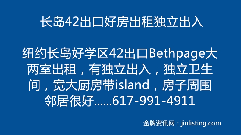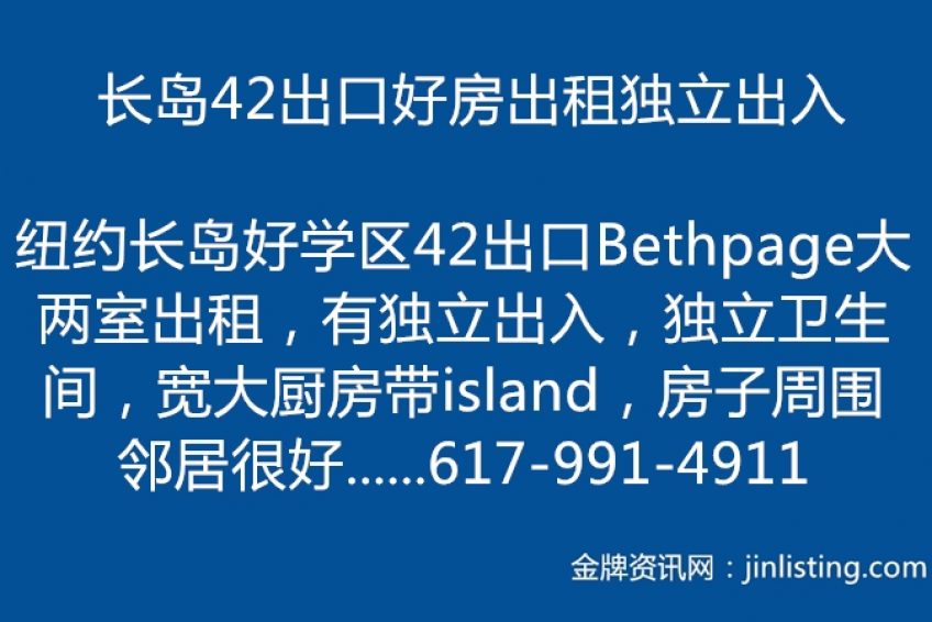 纽约长岛好学区42出口Bethpage大两室出租,有独立出入,独立卫生间,宽大厨房带island,房子周围邻居很好,社区环境很安静,周围有cvs,H&Y超市,多个老外超市,餐馆,临火车站,交通方便,精致装修,$2000+utilities, 水网络包免费。另有大一室一厅出租,独立卫生间和厨房出租,$1500+utilities, 水网络包免费。现在可以入住。有意者请短信联系,电话617-991-4911,melody(只接受短信联系),适合留学生或单身人士。
