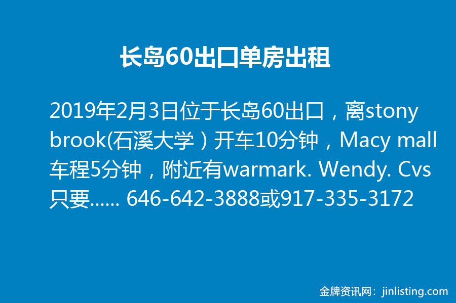 长岛60出囗单房出租 位于长岛60出口,离stony brook(石溪大学)开车10分钟,Macy mall车程5分钟,附近有warmark. Wendy. Cvs 只要步行就能到达,如有意可以要单间的图片# 646-642-3888或917-335-3172