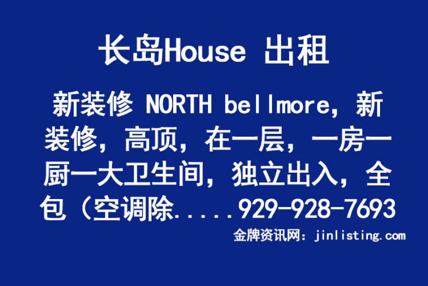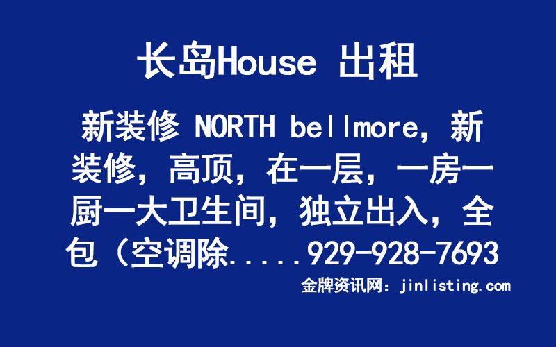 长岛House 出租,新装修 NORTH bellmore,新装修,高顶,在一层,一房一厨一大卫生间,独立出入,全包(空调除外)有冰箱洗衣机,房子干净漂亮,欢迎看房,短信:929-928-7693