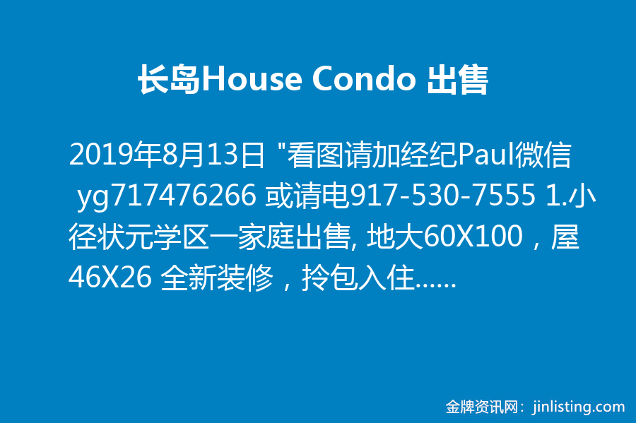 长岛House/Condo 出售 “看图请加经纪Paul微信 yg717476266 或请电917-530-7555 1.小径状元学区一家庭出售, 地大60X100,屋46X26 全新装修,拎包入住,3房2.5浴,双车库,售118万,可议价, 2.小径状元学区高级condo出售,复式公寓,全新装修,拎包入住,3房3浴,含车库,2个车位(共可停3部车,有阳台和后院,游泳池,网球场,售84万 3.大劲南校捡漏价,只售69万8,需全现金过户,现状出售,适投资自住,需全部装修!”