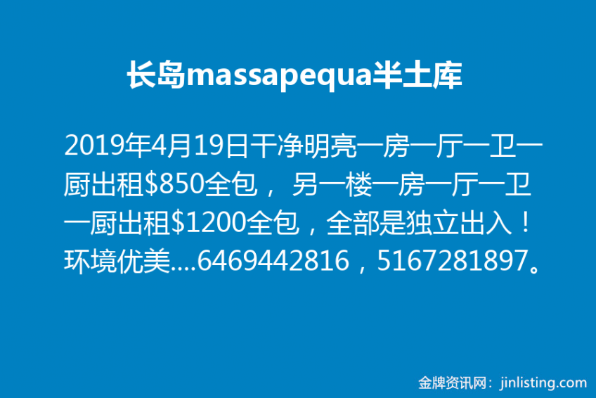 长岛massapequa半土库干净明亮一房一厅一卫一厨出租$850全包, 另一楼一房一厅一卫一厨出租$1200全包,全部是独立出入! 环境优美,交通方便,近105,107公路,近火车站, 周围有shoppingplaza、加油站、多家银行、酒庄、 stop & shop 超市、餐馆、Marshall……. 欢迎有车,在附近工作的正职单身或夫妇入住! 意者请联系:6469442816,5167281897。 谢谢