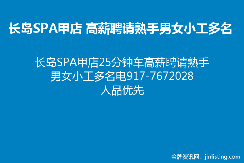 长岛SPA甲店25分钟车程,高薪聘请熟手男女小工多名,电917-7672028 人品优先