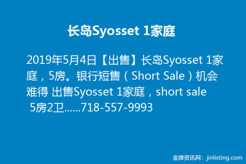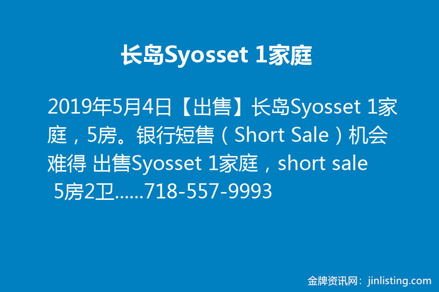 【出售】长岛Syosset 1家庭,5房。银行短售(Short Sale)机会难得 出售Syosset 1家庭,short sale 5房2卫。只售$495,000。地税:$11,650。土地面积:60×120。机会难得,不容错过。预约看房请电顺成施先生。电话:718-557-9993 微信:7185579993