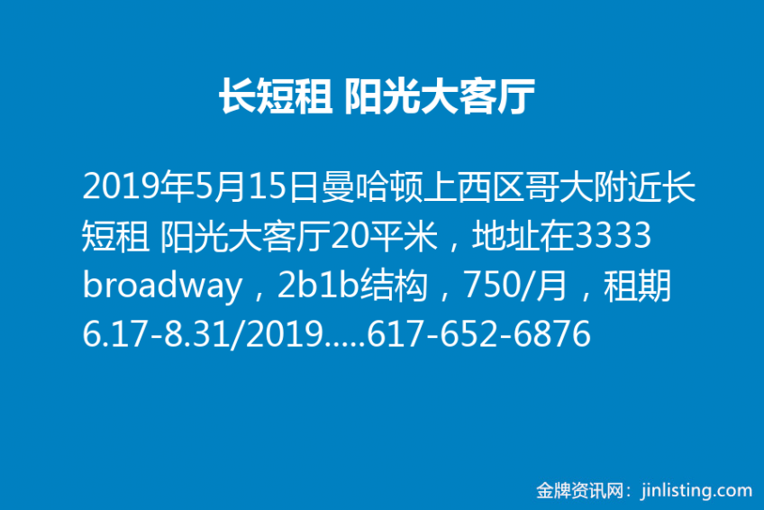 曼哈顿上西区哥大附近长短租 阳光大客厅20平米,地址在3333 broadway,2b1b结构,750/月,租期6.17-8.31/2019;周围超市、饭馆林立,生活交通十分便利,步行到地铁一号线3分钟,到哥大主校区15分钟,曼哈顿音乐学院15分钟,City College10分钟,公寓24小时doorman,哥大校车到门口,非常安全!联系方式:微信zhangqionyuan,电话+1 (617) 652-6876,本人非中介,非诚勿扰