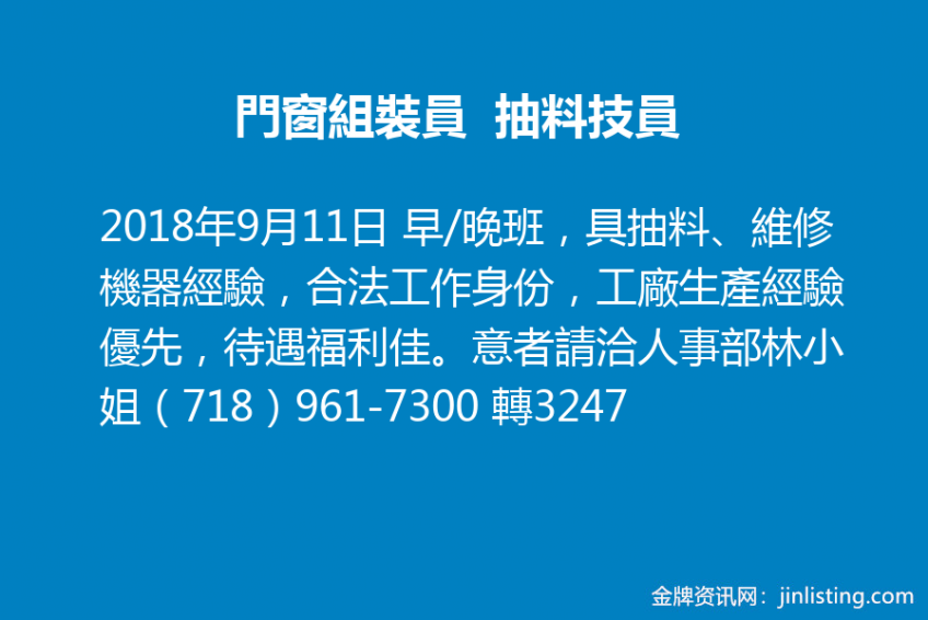 門窗組裝員 / 抽料技員(718)961-7300 轉3247