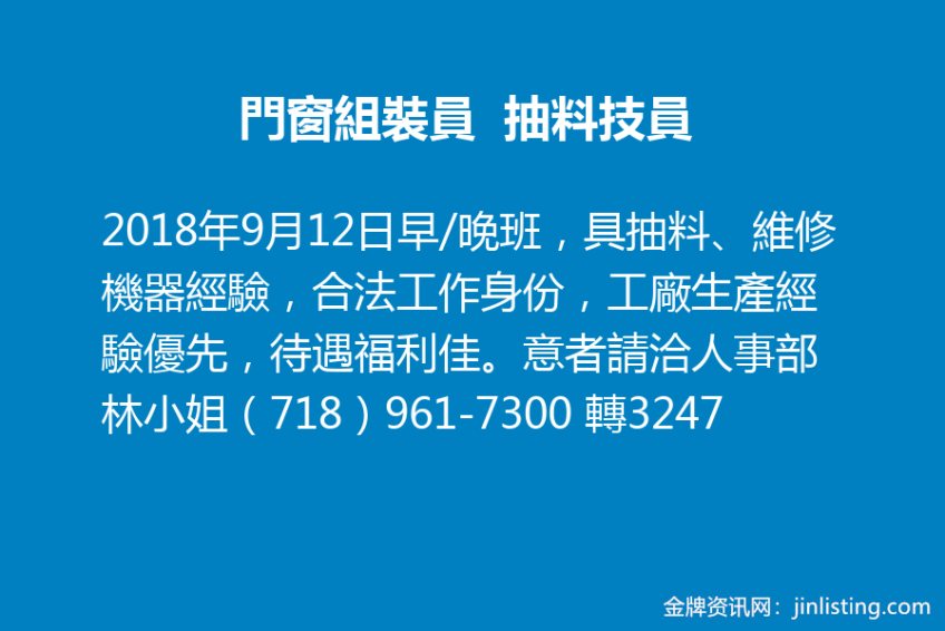 早/晚班,具抽料、維修機器經驗,合法工作身份,工廠生產經驗優先,待遇福利佳。意者請洽人事部林小姐(718)961-7300 轉3247