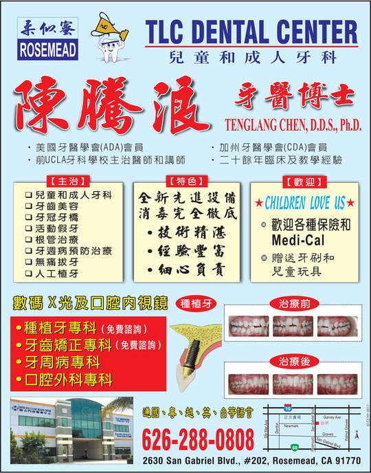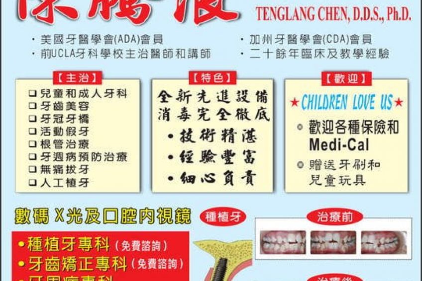 CHEN, TENGLANG D.D.S., PH.D.陈腾浪医师不仅是美国牙医学会ADA会员,加州牙医学会CDA会员,更是前UCLA牙科学校主治医师和讲师,具有廿年临床及教学经验。其技术精湛丶细心负责,全新先进设备,消毒完全彻底,是陈医师赢得好口碑,成为罗省牙科行业佼佼者的原因。由陈医师主持的TLC牙科诊所提供:儿童牙科丶牙齿美容丶牙冠牙桥丶活动假牙丶人工植牙丶根管治疗丶牙周病预防治疗丶无痛拔牙等全方位的服务。陈医师特别擅长儿童牙病的防治,提供各种儿童牙科治疗,并有小玩具送,儿童牙病患者,一定会喜爱该诊所。 TLC儿童和成人牙科欢迎各种保险和Medical,急诊者无需预约,优惠年长者和无保险者。