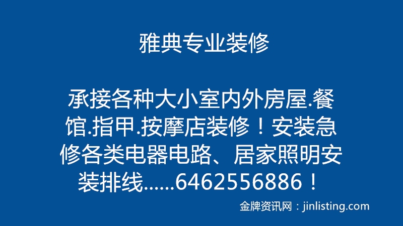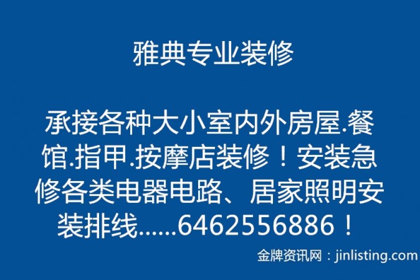 雅典专业装修,承接各种大小室内外房屋.餐馆.指甲.按摩店装修!安装急修各类电器电路、居家照明安装排线。维修冷暖、安装厨油烟机、水管水喉、通下水道、更换热水炉、以及其他装修等。我们秉承当兵之人的本分和诚实,没有华丽的语言,只有三十年的经验服务及合理的收费尽量让新老客户满意!来吧!也许你多打一个电话就兴许让你节约一小笔资金! 电话6462556886!如不接电话请短信!定回!