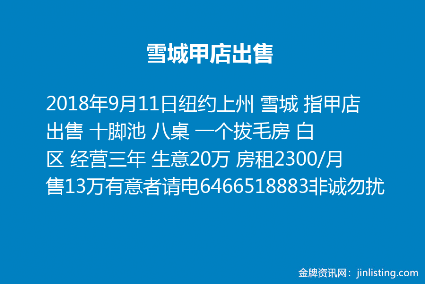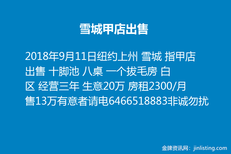 雪城甲店出售 纽约上州 雪城 指甲店出售 十脚池 八桌 一个拔毛房 白区 经营三年 生意20万 房租2300/月 售13万 有意者请电 6466518883 非诚勿扰