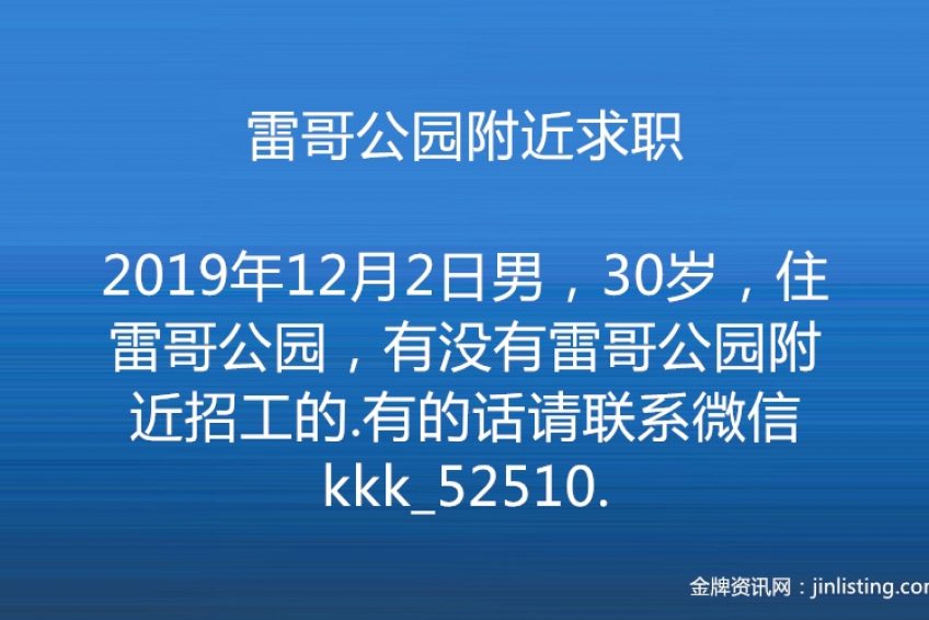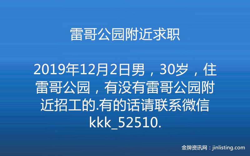 雷哥公园附近求职. 男,30岁,住雷哥公园,有没有雷哥公园附近招工的.有的话请联系微信kkk_52510.
