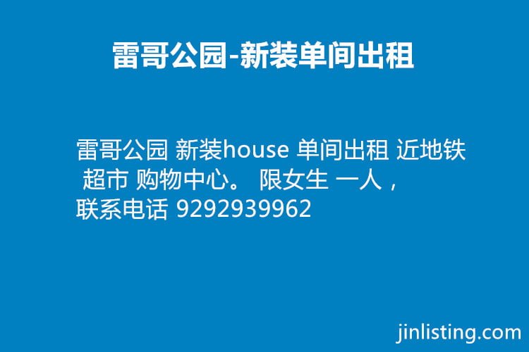 雷哥公园 新装house 单间出租 近地铁 超市 购物中心。 限女生 一人,联系电话 9292939962